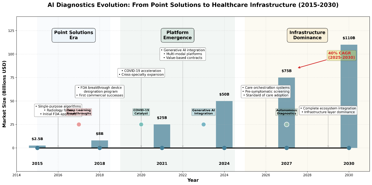 Figure 1: Diagnostic AI Evolution Timeline (2015-2030) – The shift from point solutions to infrastructure dominance.