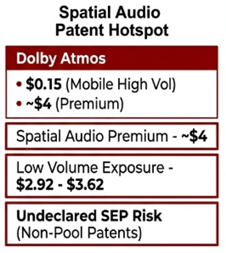 Dolby holds a strong position in spatial audio patents. Patent experts describe Dolby Atmos patents as “hard to bypass,” showing rare protection in complex technology. Spatial audio licensing rates reflect this strength: mobile devices at high volume cost about 0.15 dollars per unit, while premium implementations reach around 4 dollars per device. By contrast, MPEG-H 3D Audio licensing ranges from 0.44 to 0.80 dollars per unit at high volumes. This highlights Dolby’s ability to charge premium dollars and maintain a clear edge in the spatial audio market.