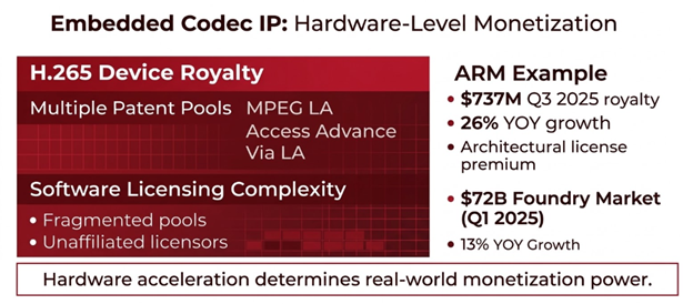 This complexity shows how hardware acceleration for video codecs and embedded codec IP have become central levers for SoC IP monetization. Beyond technical performance, these elements create new semiconductor royalty revenue streams, enforce foundry IP lock‑in, and establish economic control points that were once managed through software.