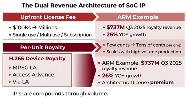 - ARM architectural license models generate hundreds of millions in quarterly royalties, proving the strength of the semiconductor IP licensing model.